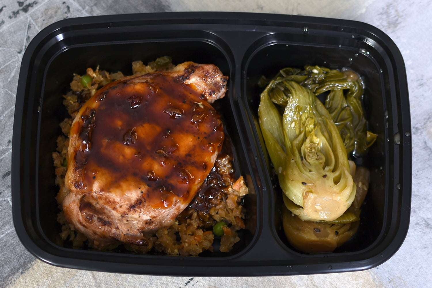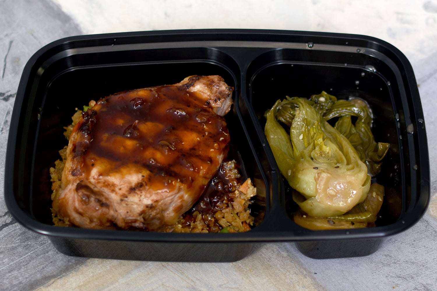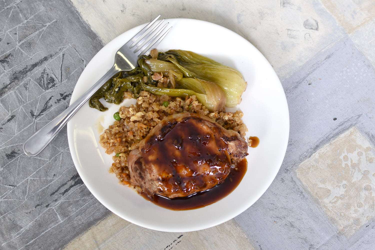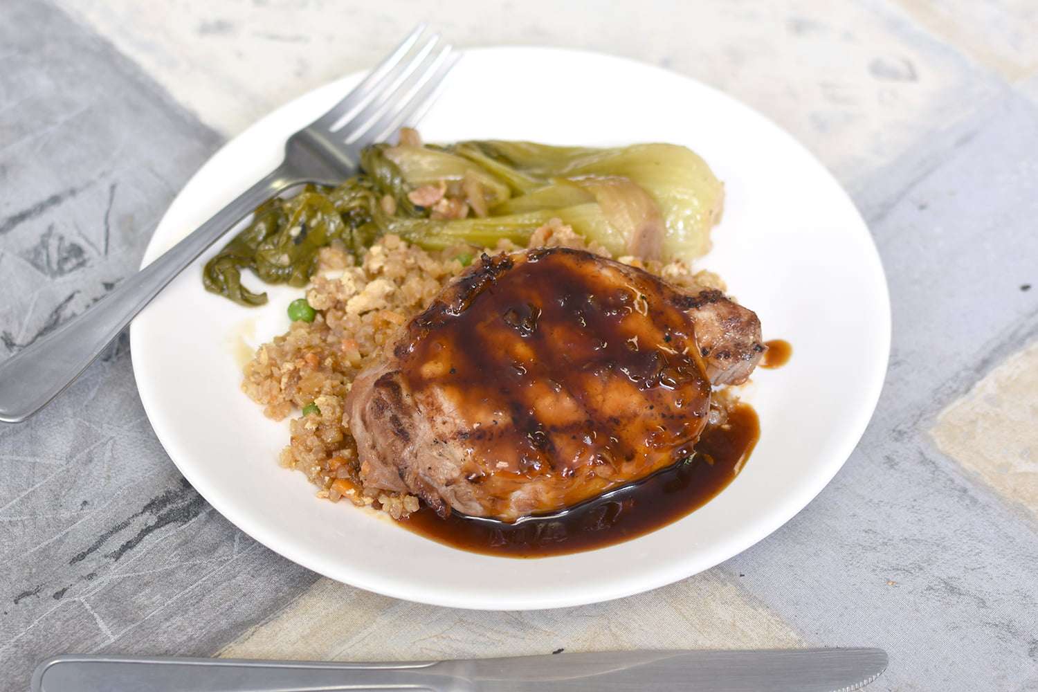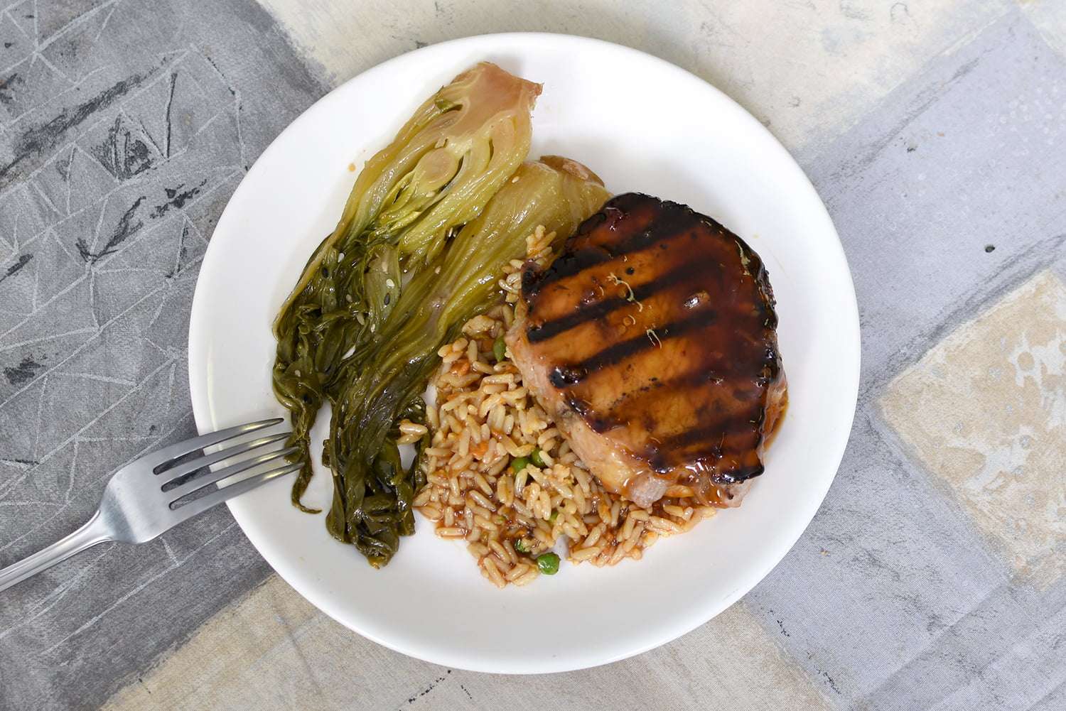 6-oz boneless pork loin chop, marinated and grilled. Finished with a honey, garlic, ginger, sweet chili glaze.
