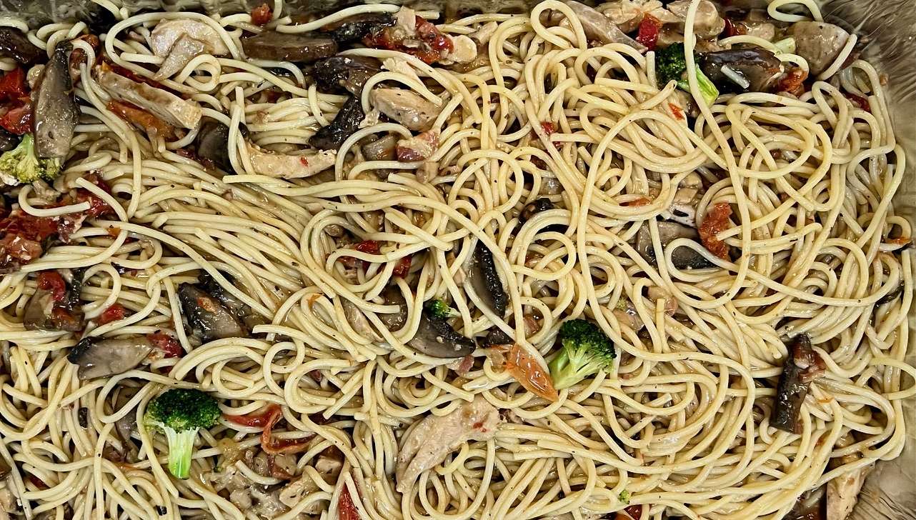 Spaghettini Loring — breast of chicken, pancetta, Spanish onion, sundried tomatoes, portobello mushrooms, broccoli, and thin spaghetti tossed in a rich chicken broth with fresh herbs.