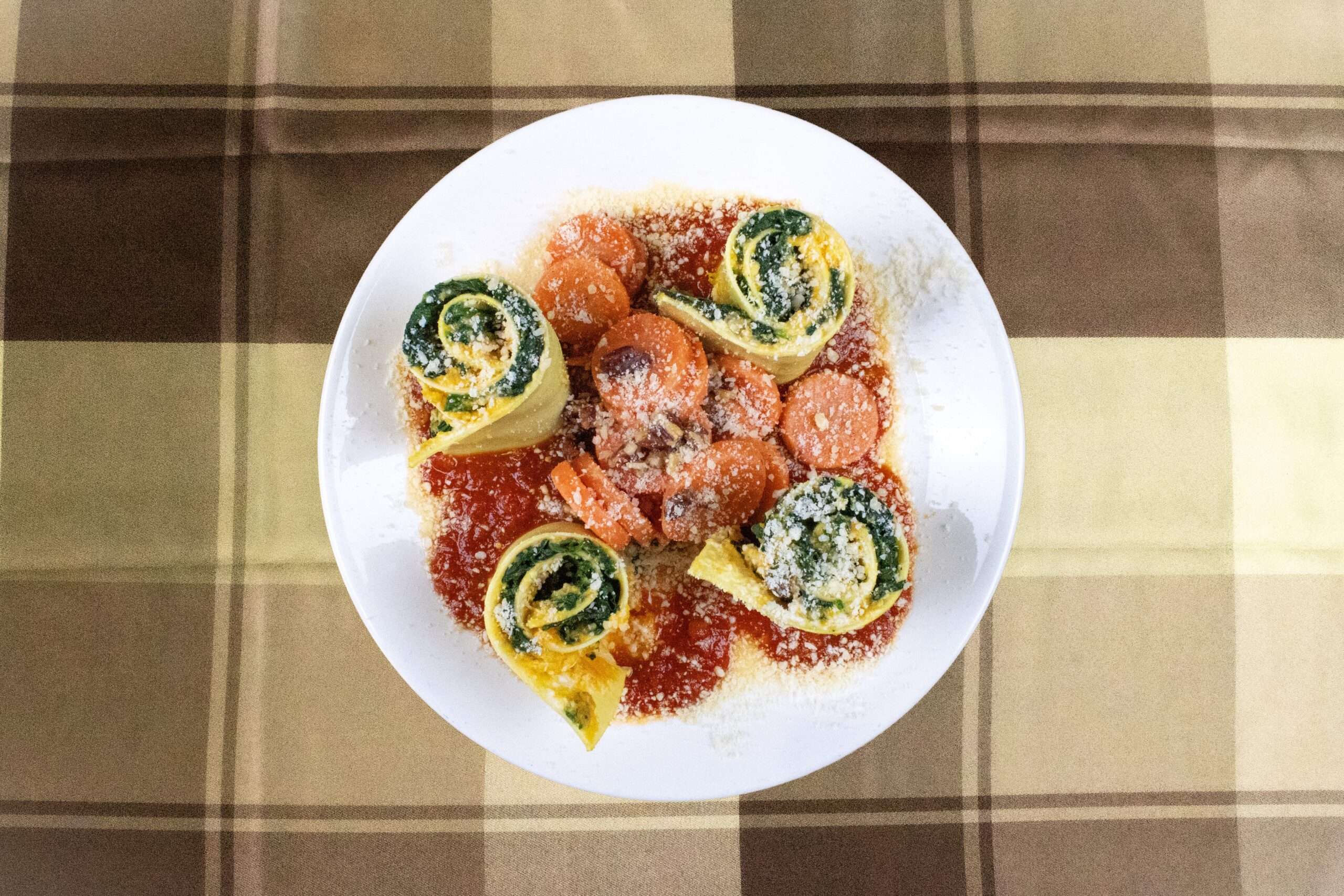 Roasted Squash and Spinach Lasagna Rolls — butternut squash, baby spinach, Felix’s “Paleo Marinara Sauce”, tofu ricotta, and vegan parmesan cheese rolled in lasagna noodles. Served with maple pecan carrot coins.